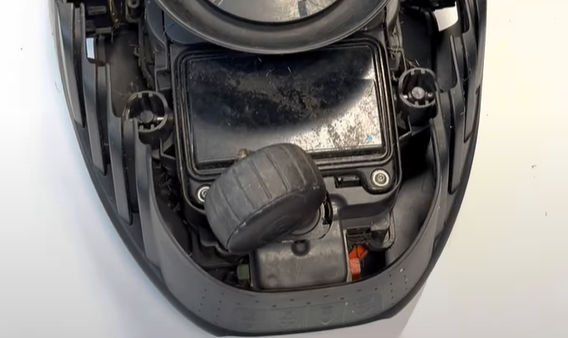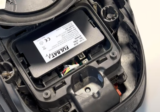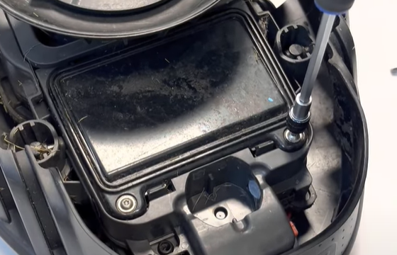 2. Sen tar vi torxmejseln för att skruva upp luckan till batteriet. När du har skruvat ut skruvarna från luckan kan du använda en spårmejsel för att trycka upp den. Precis som bakhjulet sitter batteriet fast i plastklämmor som du lätt kan hålla in med fingrarna för att få ut batteriet, i samma veva kopplar du ut anslutningen till batteriet.