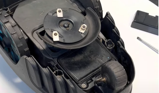 1. Börja med att vända på robotgräsklipparen så att den ligger på ryggen (plastkåpan) så att hela undersidan är synlig. Om du vill ha mer utrymme att arbeta på kan du ta bort knivdisken tillsammans med knivskyddet, men det behövs inte om dom inte är i vägen för batteriet. När klipparen är upp och ner kan du lokalisera vart batteriet sitter och ta bort bakhjulet på maskinen. Bakhjulet för du bort genom att klicka in två plats flärpar på sidorna av hjulet, det kan du göra med händerna för att sen dra ut hjulet.