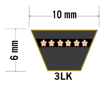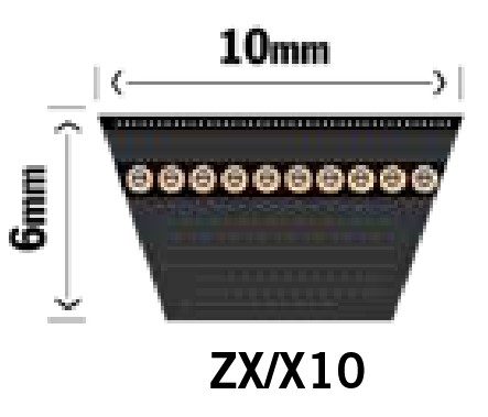 Din rem mäter 10x6mm och är förmodligen en Z-profil rem. Denna rem mäts invändigt i tum. Mät remmen utvändigt och dra av 38mm från summan. Dela sedan med 25,4.