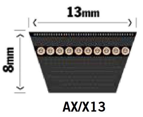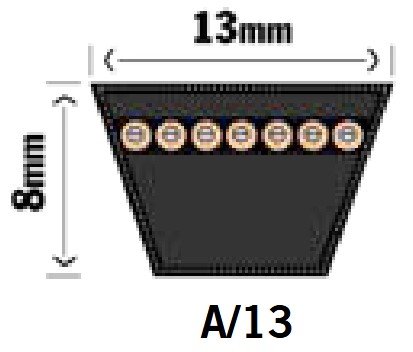 Din rem mäter 13x8mm och är förmodligen en A-profil rem. Denna rem mäts invändigt i tum. Mät remmen utvändigt och dra av 50mm från summan. Dela sedan med 25,4.