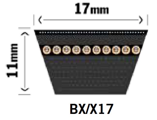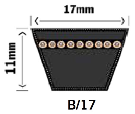 Din rem mäter 17x11mm och förmodligen en B-profil rem. Denna rem mäts i invändig tum. Mät remmen utvändigt och dra av 76mm från summan. Dela sedan med 25,4.