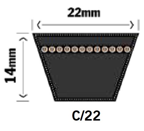 Din rem mäter 22x14mm och förmodligen en C-profil rem. Denna rem mäts i invändig tum. Mät remmen utvändigt och dra av 102mm från summan. Dela sedan med 25,4.