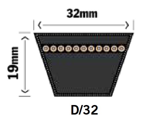 Din rem mäter 32x14mm och förmodligen en D-profil rem. Denna rem mäts i invändig tum. Mät remmen utvändigt och dra av 127mm från summan. Dela sedan med 25,4.