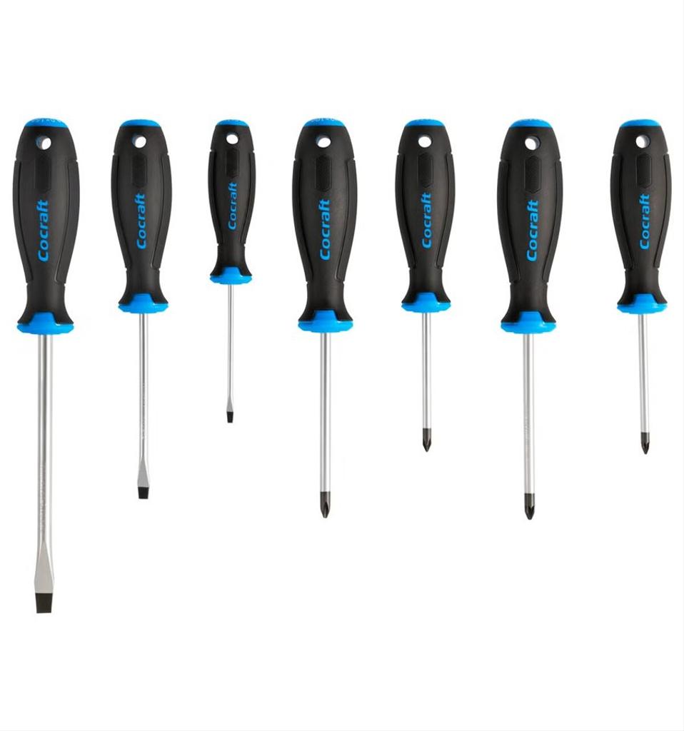 Sats med skruvmejslar av hög kvalité. Handtag med mjukt grepp. Klingor av förkromat kromvanadiumstål och svartoxiderad spets