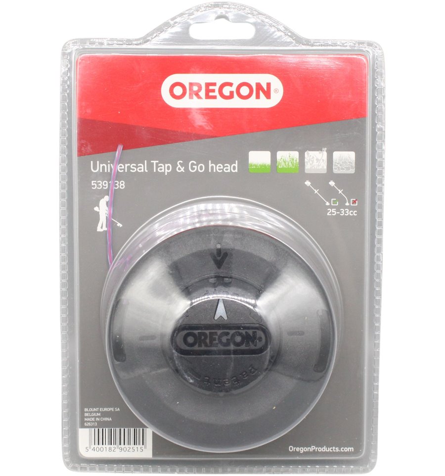 Universalt trimmerhuvud från Oregon som passar de flesta röjsågar som normalt har bult som låsning för tex röjklinga. Sats med brickor ingår.